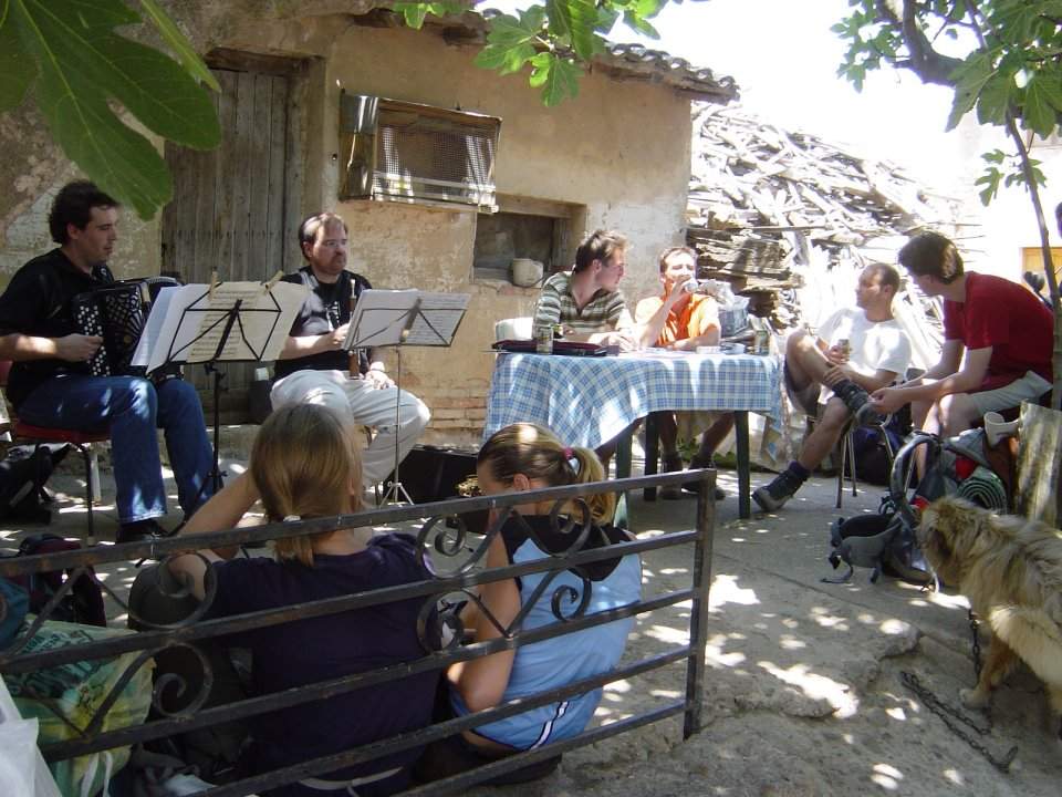 Desde 1981 el 21 de junio se celebra en todo el mundo La Fiesta de la Música. El objetivo principal de este día es sacar la música a la calle, acercarla a la vida cotidiana. Los músicos, tanto aficionados como profesionales, se unen para compartir la experiencia maravillosa que es “la música en directo”. Desde hace 4 años, Escuela de Música Píccolo y Saxo junto a la Asociación Píccolo Combo organizan diversos conciertos en Logroño. Este año hemos llevado la música a colegios, salas de concierto, calles y plazas, y como punto especial recibimos a los peregrinos en la entrada de la ciudad. El lugar elegido fue el monte Cantabria. Allí el Dúo del Pozo, acordeón y dulzaina-saxo esperaba a los caminantes a la sombra de la higuera, donde Mari, la hija de la Sra. Felisa ofrece refrescos, conversación y un rincón donde descansar antes de afrontar el último esfuerzo del día. Según se acercaban los peregrinos anunciaban su localidad o país de origen y se les recibía con música de su tierra. Lo primero que hacían era ponerse a bailar. El ritmo podía al cansancio. Tarantelas para los italianos, sambas para los brasileños y para todos música riojana. La danza de Pedroso, el pasacalles de Galilea o la jota de Logroño abrieron la puerta de La Rioja a todos los peregrinos que llegaron a Logroño el día que comenzaba el verano y que en todo el mundo se celebraba la Fiesta de La Música.